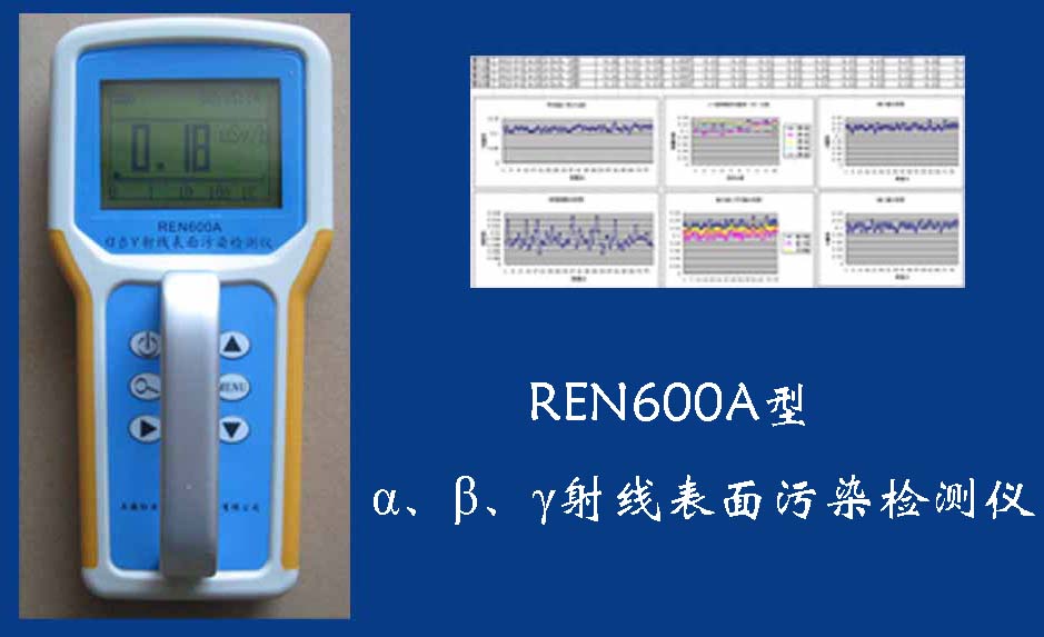 REN600A型α、β、γ射線表面污染檢測儀即可檢測α、β、γ射線,也能檢測到X射線,它采用高速嵌入式微處器作為數據處理單元,點陣式大屏幕LCD液晶顯示,讀數清晰、操作方便,具有400條超大容量數據存儲。儀器采用進口的大面積MICA蓋革探測器,具有較高探測效率,可進行α、β輻射表面污染檢測和X、γ輻射劑量率的監測。此外通過配套的RenriCont表面污染管理軟件可將存儲的數據讀出后分析。可廣泛用在制藥廠、實驗室、發電廠、進出口商檢、采石場、環境實驗室、環境污染調查、核安全應急、緊急狀況營救站、金屬處理廠、地下油田、供油管道裝備、醫院核醫學科、同位素實驗室、環境保護和警察局等部門。REN600A型α、β、γ射線表面
